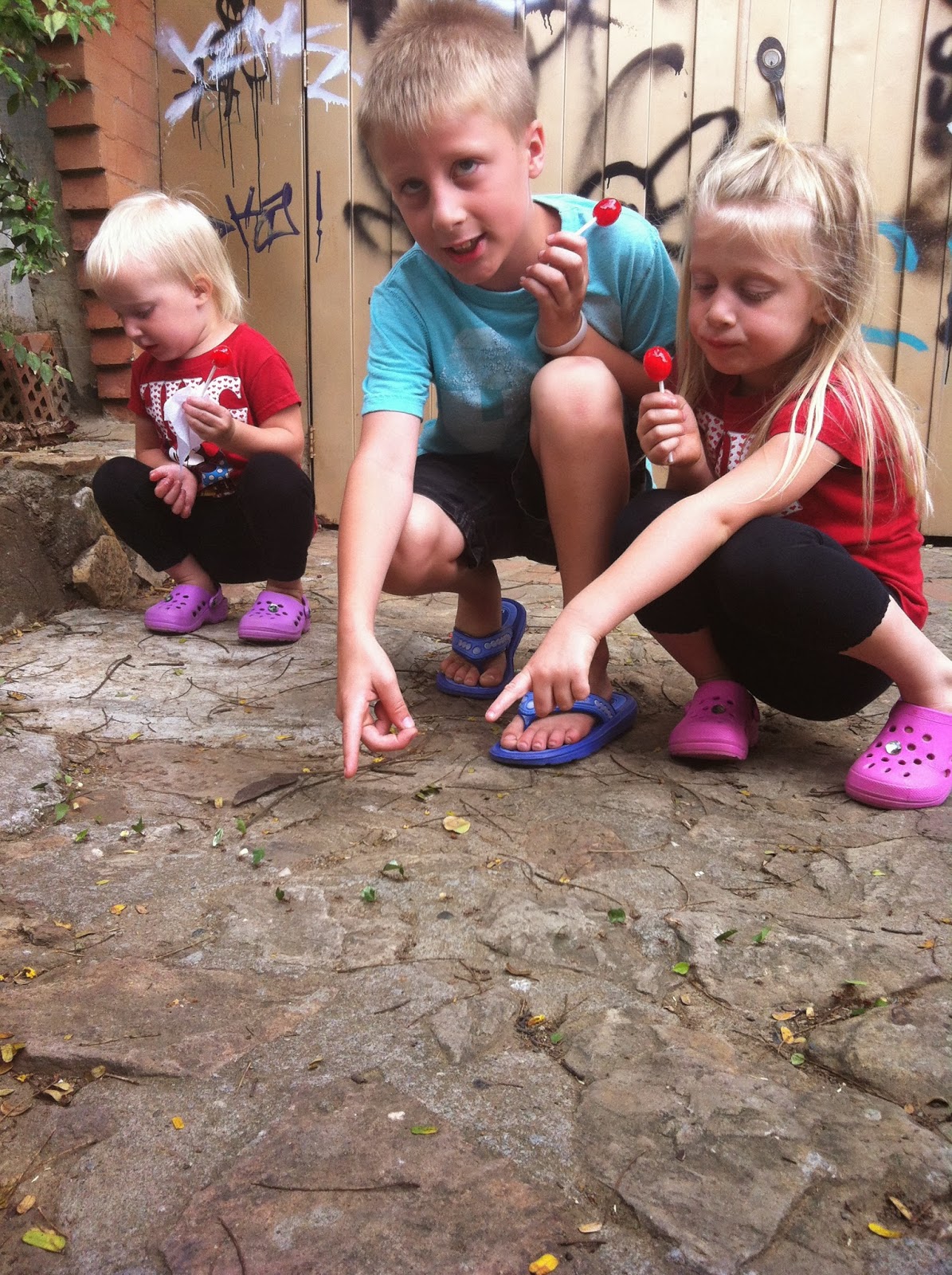 Watching giant ants carrying little leaves across the sidewalk.